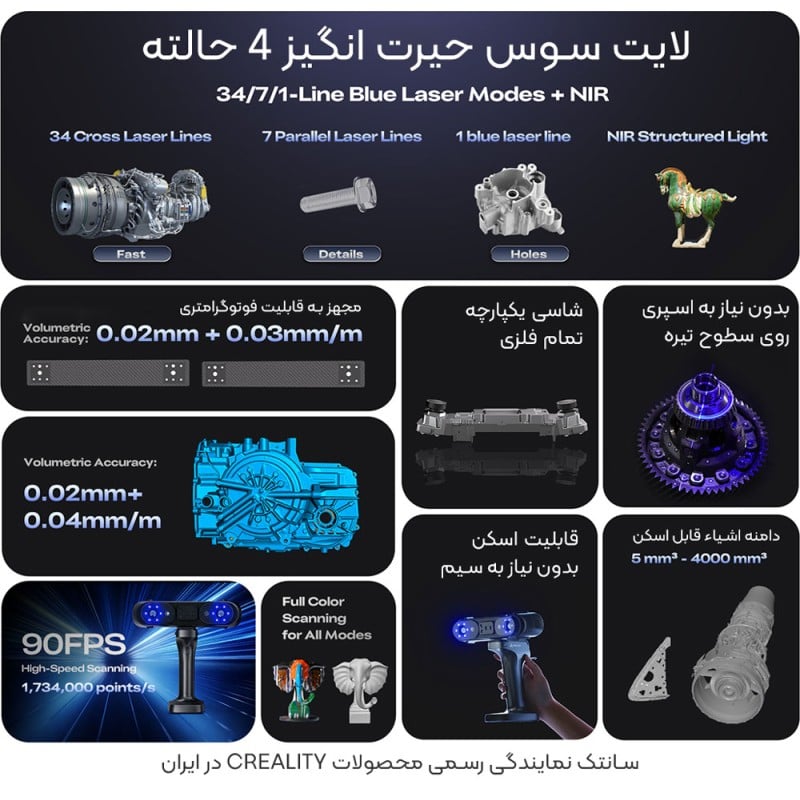 اسکنر سهبعدی Creality Sermoon X1 یک دستگاه فوقپیشرفته برای اسکن صنعتی، مهندسی معکوس و کنترل کیفی غیرمخرب است که با بهرهگیری از فناوریهای لایتسورس هیبرید—شامل ۳۴ لیزر متقاطع، ۷ لیزر موازی، ۱ لیزر تکخط برای عمقسنجی و سیستم NIR ساختاری—تعریفی جدید از اسکن دقیق ارائه میدهد. این دستگاه با دقت در حد ۰.۰۲ میلیمتر و سرعت اندازهبرداری ۱,۷۳۴,۰۰۰ نقطه بر ثانیه در حالت لیزر، توانایی ثبت سریع و دقیق جزئیات پیچیده را دارد. Sermoon X1 بهگونهای طراحی شده که پاسخگوی سختترین شرایط صنعتی باشد و تمامی نیازهای اسکن قطعات کوچک تا ساختارهای بزرگ را از طریق زاویه دید وسیع و محدوده عملکرد 200 تا 600 میلیمتر برآورده کند.