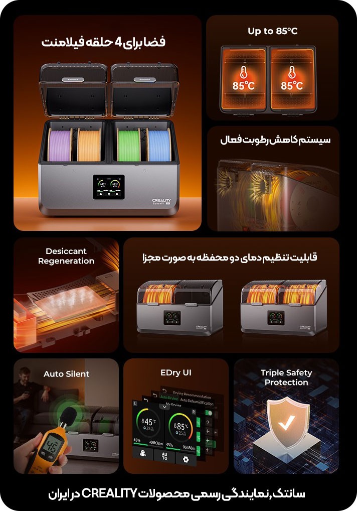 اگر کیفیت چاپ، دقت در جزئیات، و دوام قطعات برای شما اهمیت دارد، خشککردن صحیح فیلامنتها یک ضرورت است، نه یک انتخاب. SpacePi X4 از برند معتبر Creality با طراحی هوشمند، عملکرد بالا، و امکانات ویژهاش، یکی از بهترین گزینهها در بازار برای نگهداری، احیا و استفاده حرفهای از فیلامنتهای چاپ سهبعدی است.