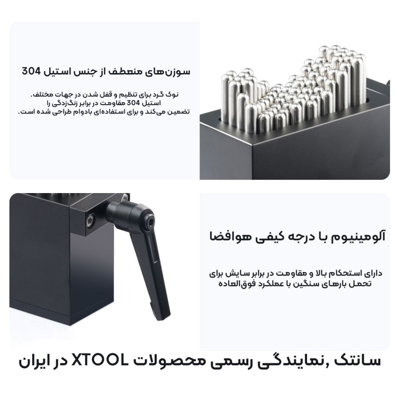 فیکسچر منعطف xTool با تمامی دستگاههای لیزری برند xTool سازگار است. تنها نکته مهم برای استفاده از آن، وجود پایه افزایش ارتفاع (Riser Base) یا ماژولهای افزایش ارتفاع است تا فضای کافی برای عملکرد کامل پینها و تثبیت قطعه کار فراهم شود.